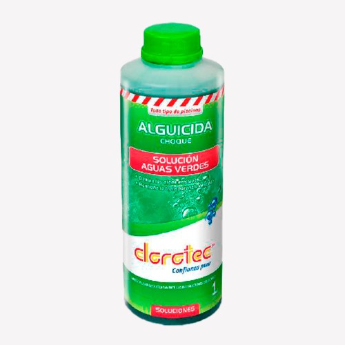 Elimina la mayoría de las algas. Protege la desinfección del cloro. Mantiene la transparencia deseada. Dosis: 70 ml/cc de Alguicida Choque Clorotec ® por cada 10m3(10.000litros) de agua. Instrucciones: Diluir el producto en un balde con agua y esparcir la mezcla en la pileta, su máxima acción se evidencia a las 96hs de contacto. Se puede colocar el filtro en RECIRCULACION para ayudar que el producto se mezcle en todo el volumen del agua, por un tiempo no menor a una (1) hora. Con fuerte presencia de algas agregar una dosis doble para el volumen de su piscina de CLORO SHOCK Clorotec®. Luego filtrar el agua diariamente por un período mínimo de 6 horas. Consultar al fabricante del filtro para determinar el tiempo ideal. Aspirar el fondo de la piscina cuando fuera necesario.